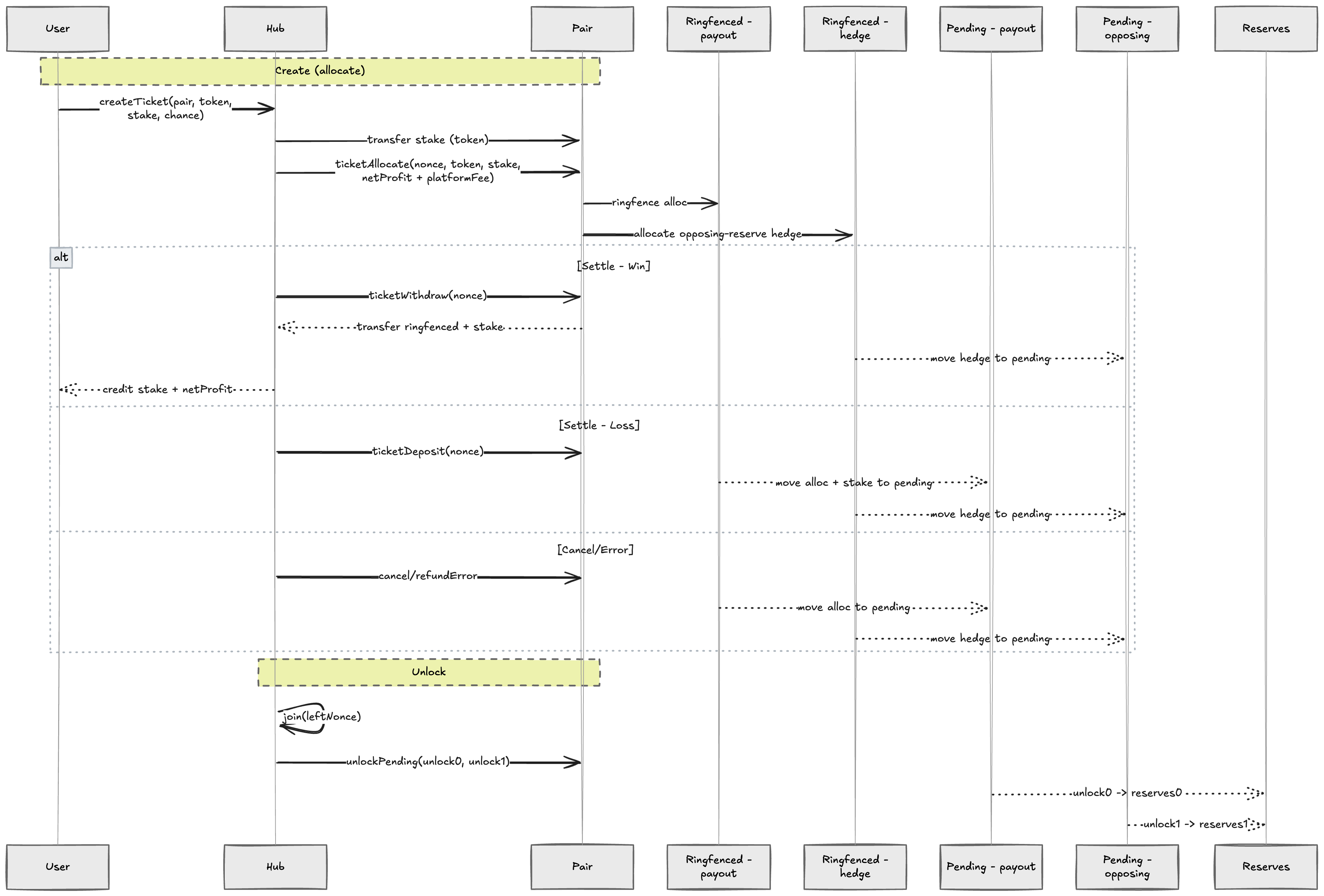 When a ticket is marked as a loss, the player stake is retained by LPs. The stake and ringfenced funds, including unused winnings and hedge, are moved to the pending pot.