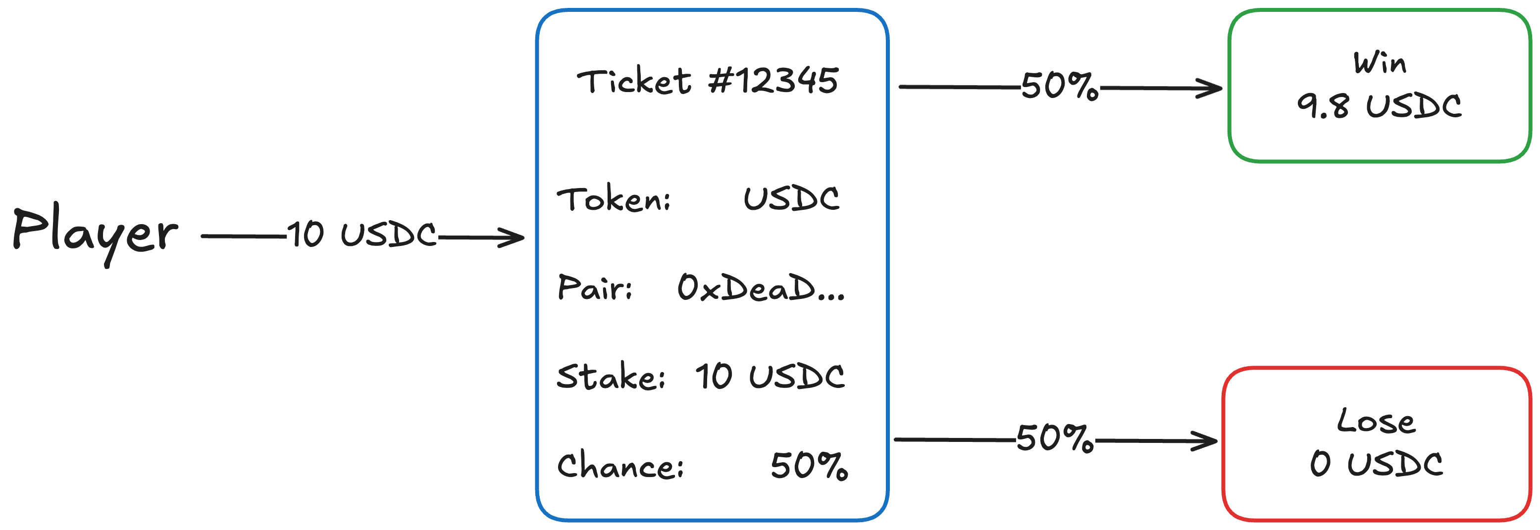 Provide a compatible game token (or ETH), select a pool, choose a player stake and win chance, and submit a ticket to the protocol. The player stake is taken at the time of ticket creation and is returned on a winning ticket, alongside winnings drawn from the target pool.